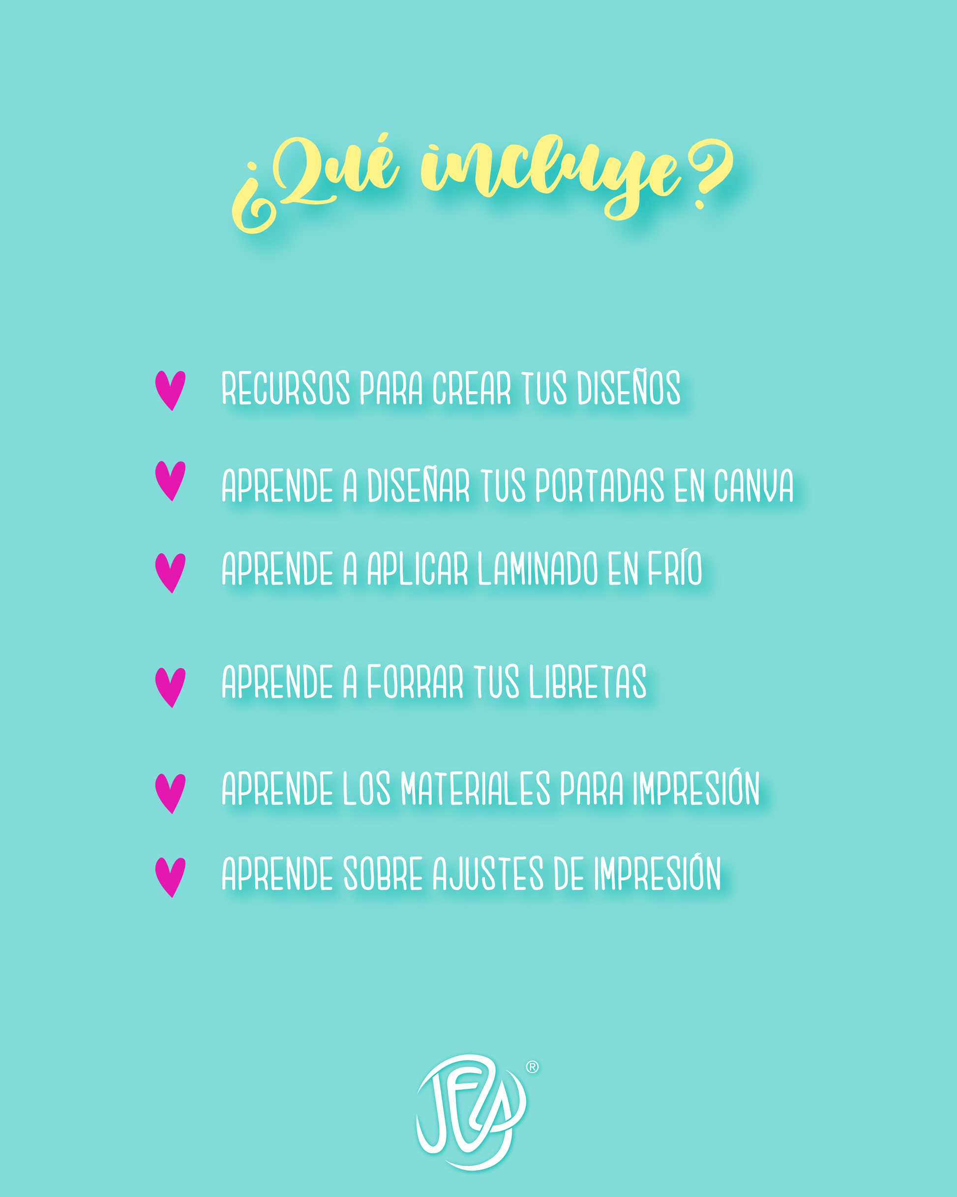 En este curso de diseño de forros en Canva recibirás recursos exclusivos para crear tus propios diseños, aprenderás los ajustes de impresión para obtener acabados profesionales, conocerás los mejores materiales y descubrirás cómo aplicar laminado en frío para proteger y embellecer tus libretas.